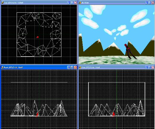 In order to implement the Snowman level we had to create a series of similar but different snowmen models using MED. We used the bones modeling technique to animate a spinning snowman. We planned for this motion to display when the player touches the correct snowman. We used WED to design our level which takes place outdoors in a snowy, mountainous region. Image 1 is a screen shot of our level in WED as we were working on it.